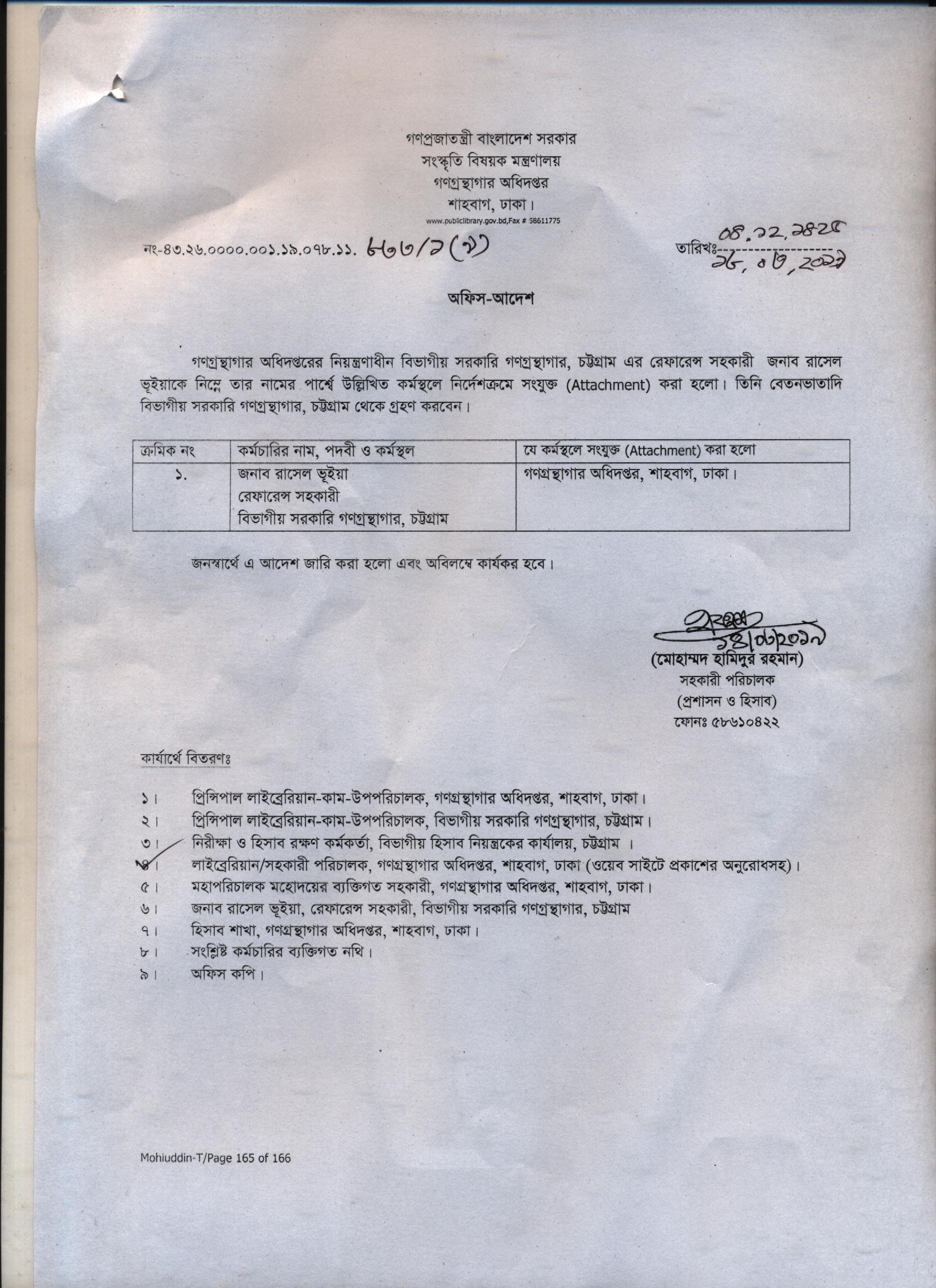 রেফারেন্স সহকারী জনাব রাসেল ভূইয়া এর বিভাগীয় সরকারি গণগ্রন্থাগার চট্রগ্রাম থেকে গণগ্রন্থাগার অধিদপ্তর শাহবাগ, ঢাকা বদলী