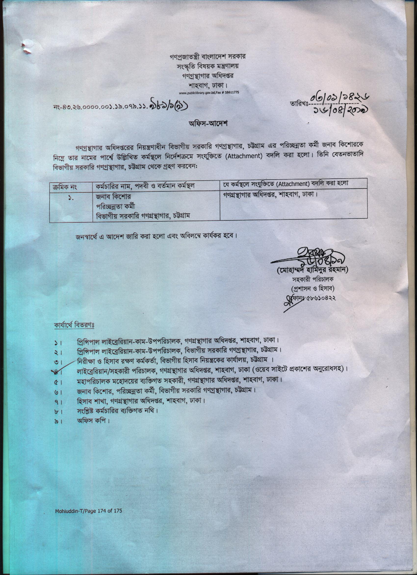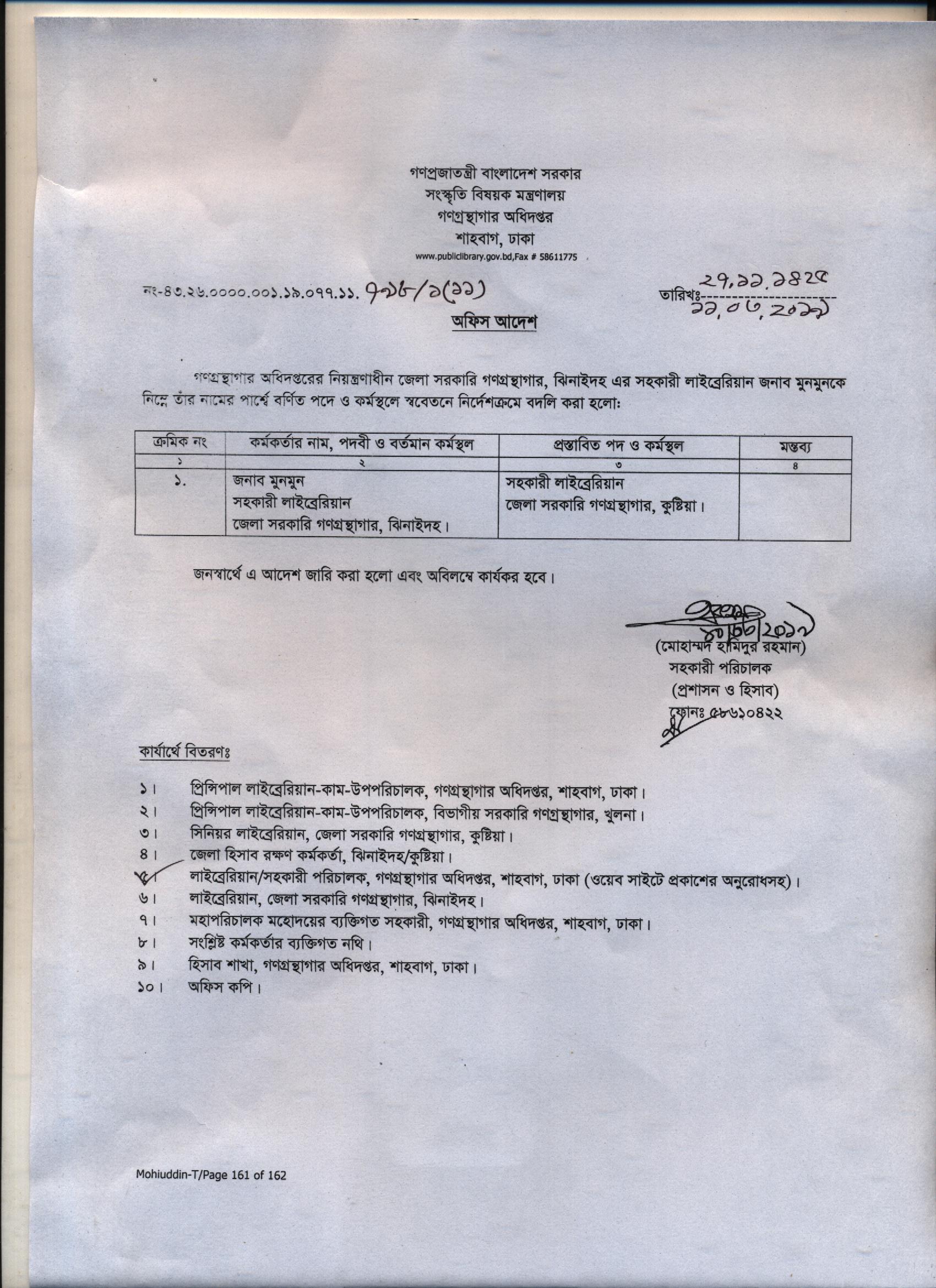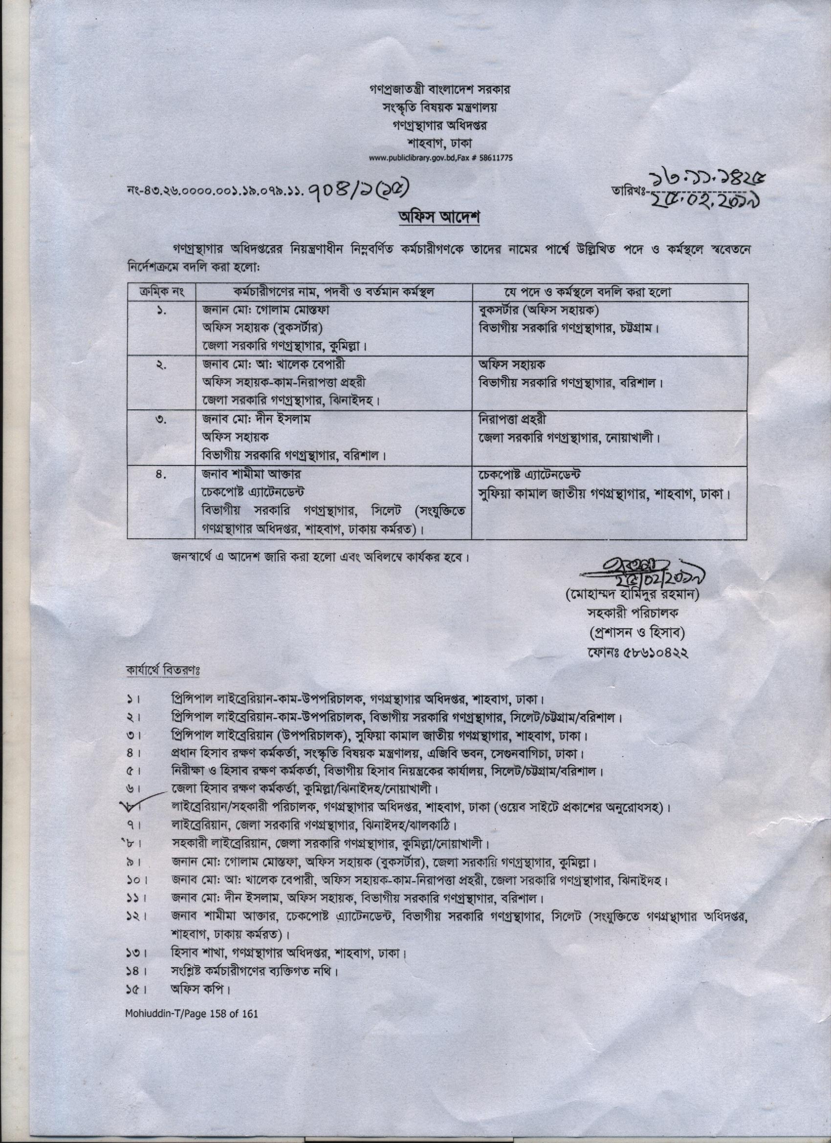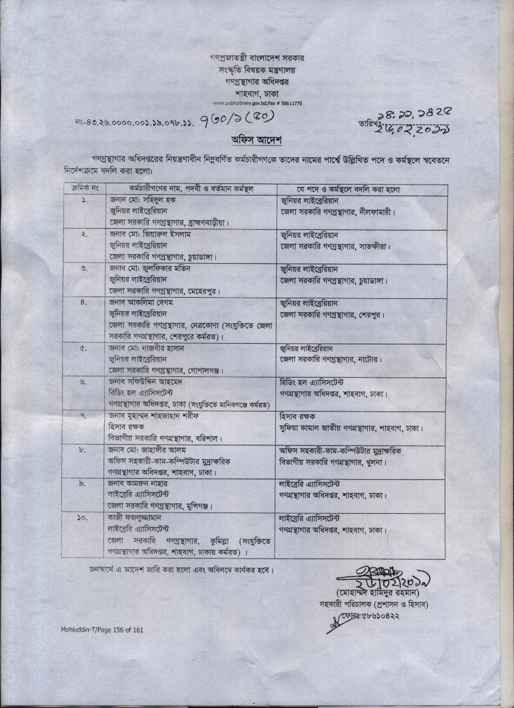 বুক সর্টার জনাব আসমা আক্তার এর জেলা সরকারি গণগ্রন্থাগার নারায়ণগঞ্জ থেকে গণগ্রন্থাগার অধিদপ্তর , শাহবাগ ঢাকায় বদলী